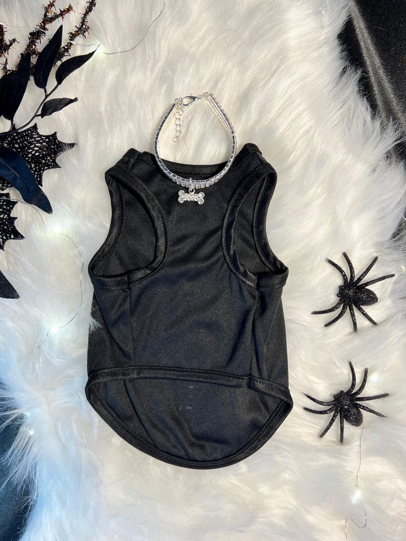 Get your furry friend ready for Halloween with this adorable pet t-shirt! The shirt features a spooky skeleton design embellished with dazzling rhinestones, adding a touch of glamour to your pet's look. Complete the outfit with the included bone necklace for extra flair. Made from soft and comfortable fabric, your pet will be both stylish and cozy all day long. Perfect for Halloween parties or festive photoshoots, this t-shirt is sure to make your pet stand out